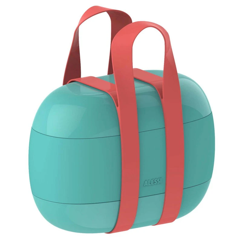 Food à porter -eväsrasia on Sakura Adachin Alessille suunnittelema hyväntuulinen tulkinta japanilaisista bento box -rasioista. Tilava eväsrasia koostuu kolmesta päällekkäin asetettavasta rasiasta ja kahdesta silikonitiivisteisestä kannesta, joiden ansiosta voit kuljettaa siististi mukana monenlaisia ruoka-aineita yhdellä kertaa. Ulkomuodoltaan Food à porter muistuttaa pientä käsilaukkua, sillä rasian sulkevat silikonihihnat toimivat samalla myös hauskoina kantokahvoina.