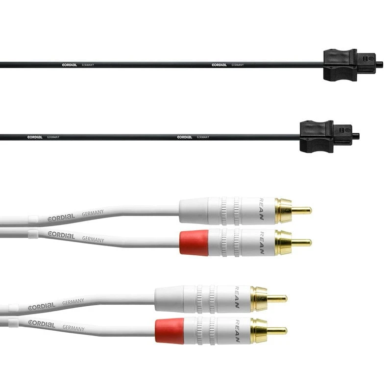 Saksalaisen Cordialin valmistama kaapelisetti on suunniteltu huipputason audionautintoihin ja täysin häiriöttömään digitaaliseen äänensiirtoon. Settiin kuuluu kaksi kaapelia: Toslink-liittimillä varustettu optinen kuitukaapeli sekä käsinjuotettu RCA-RCA-kaapelipari kullatuilla kontakteilla ja laadukkailla Rean-liittimillä.