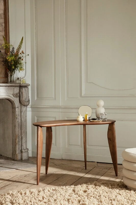 ferm LIVINGin Feve-pöytä hurmaa orgaanisella muotokielellään ja luonnollisella ilmeellään. Eurooppalaisesta, vastuullisesti tuotetusta pähkinäpuusta valmistettu pöytä muodostuu kauniisti pyöristetyistä jaloista sekä sirosta, pavun muotoisesta pöytälevystä. Pöydän nimi Feve viittaakin itse asiassa juuri sen muotoon: ranskan kielen sana fève tarkoittaa kirjaimellisesti ”papua”. Pienikokoinen pöytä sopii niin siroksi työpöydäksi tai meikkipöydäksi kuin vaikkapa kauniiksi ja käytännölliseksi laskualustaksi eteiseen.