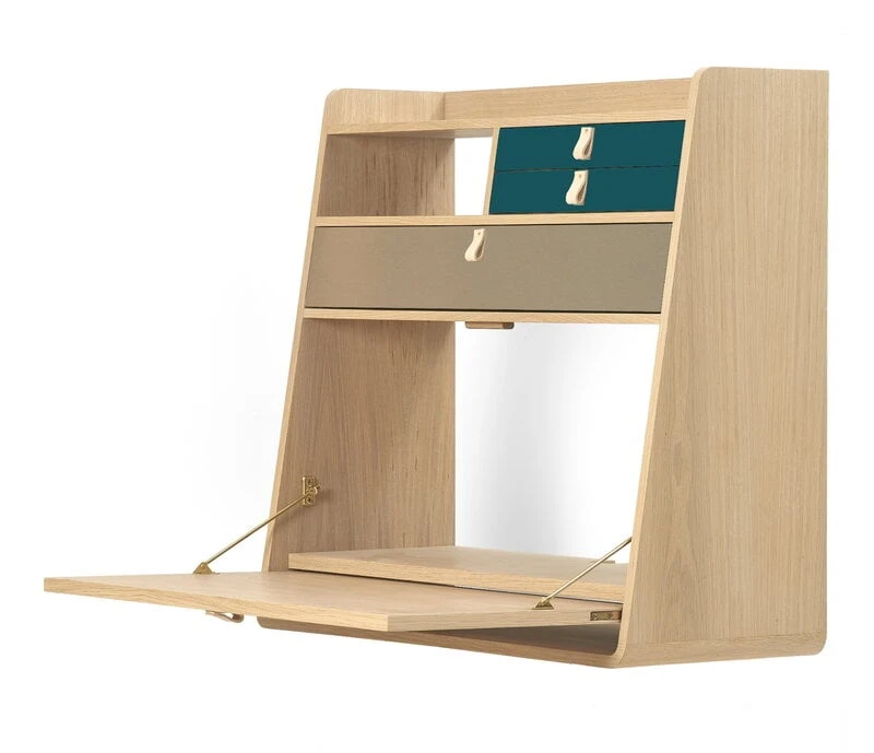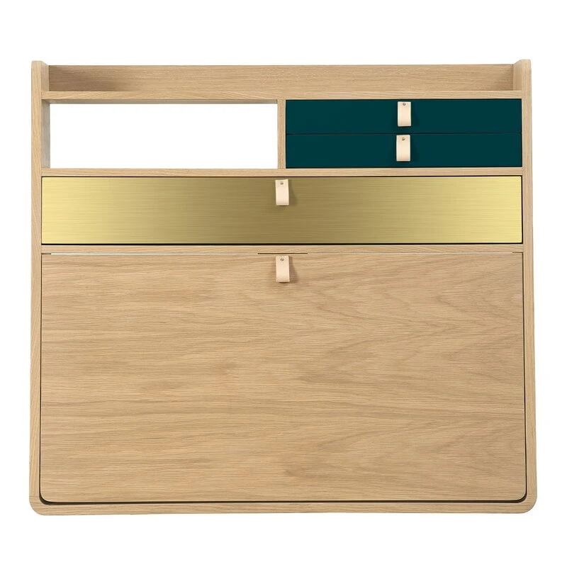 Helposti säilytyskalusteesta työpöydäksi muunneltava Gaston-lipasto sopii etätyöntekijän tai opiskelijan työhuoneeseen, mutta toimii hyvin lisätilana myös toimiston seinällä. Hyllytasot ja kolme laatikkoa varmistavat, että säilytystilaa riittää tärkeille papereille, lehdille ja muille pikkuaarteille. Florence Watinen suunnitteleman seinään kiinnitettävän lipaston elegantin ilmeen viimeistelevät vetolaatikoiden tyylikkäät nahkaiset vetimet.