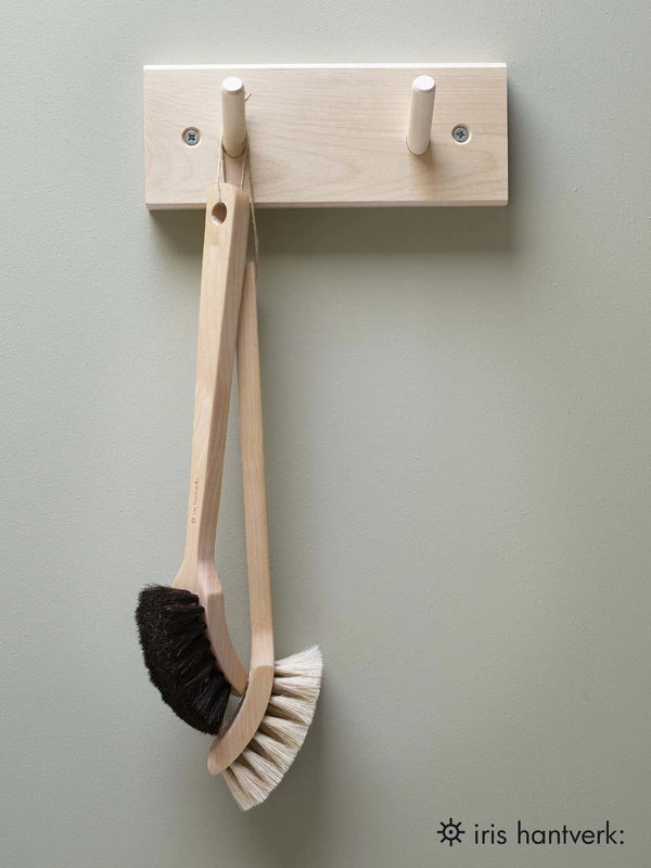 Iris Hantverkin tiskiharjassa on kaareva varsi, minkä ansiosta harja puhdistaa myös viinilasien pyöreät pohjat. Tiskiharja on valmistettu käsityönä öljykäsitellystä koivusta ja aidoista hevosen jouhista.