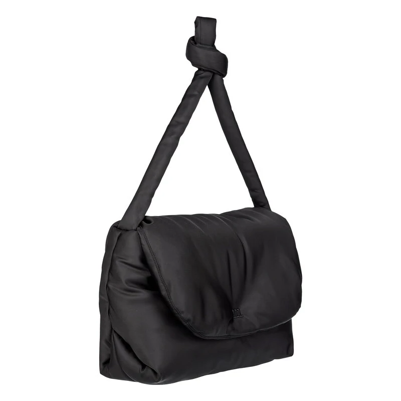 Messenger Pillow -laukku on varustettu vetoketjullisella sisätaskulla ja sen läppää koristaa yksinkertaisen elegantti, kirjailtu m-kirjain, joka on tuttu Marimekon logosta. Pehmustetun olkalaukun hihnan voi kätevästi kietaista solmulle sopivaan pituuteen.