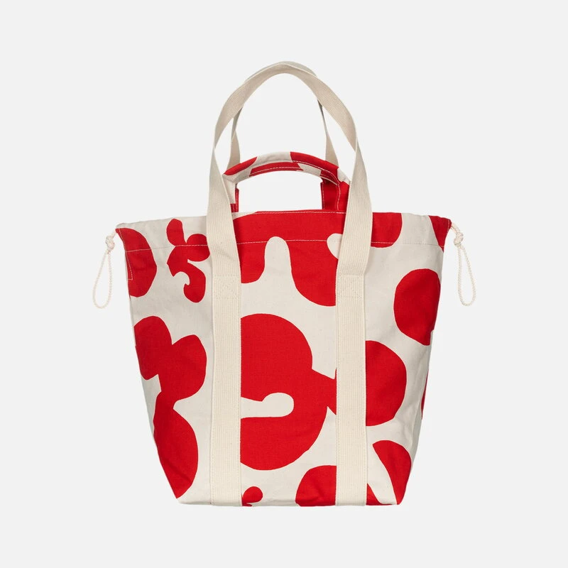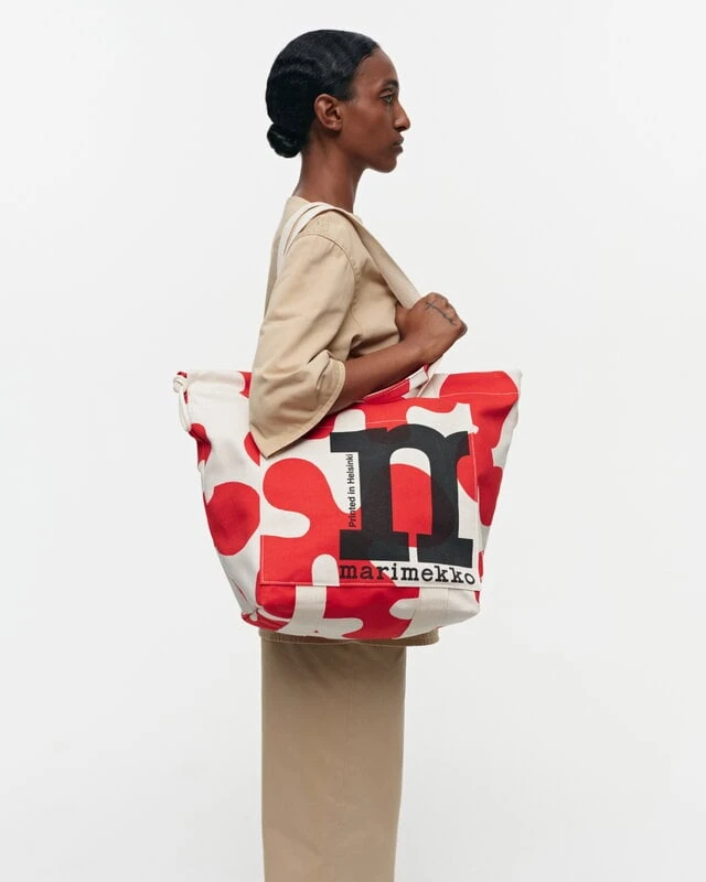 Marimekon Mono City Tote -olkalaukkua koristaa iloinen Pulloposti-kuosi luonnonvalkoisen ja kirkkaanpunaisen sävyissä. Valkaisemattomasta luomupuuvillasta valmistetussa suurikokoisessa laukussa on kahdet eripituiset kantokahvat, Marimekon logolla viimeistelty avoin ulkotasku sekä kiristysnauhat, joiden avulla voit säätää suuaukon kokoa ja muuttaa samalla laukun muotoa. Suurikokoinen kangaslaukku sopii hyvin myös ostos- tai treenikassiksi. Laukun kangas on painettu Helsingissä.