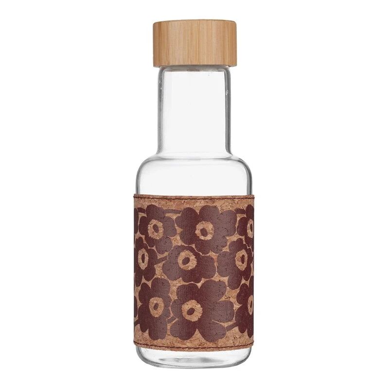 Marimekon Oiva-juomapulloa kiertää tyylikäs pullonsuojus, jossa on koristeena Maija Isolan suunnittelema ikoninen Unikko-kuosi. Korkista valmistettu suojus pitää huolen, että lasisesta pullosta saa hyvän otteen eikä se lipeä kädestä hurjemmassakaan menossa. Suloinen Oiva-juomapullo sopii mukaan niin kouluun kuin toimistoonkin tai siitä voi tarjoilla virvokkeet illalliskutsuilla. Juomapulloa voi käyttää myös viehättävänä pikkumaljakkona.