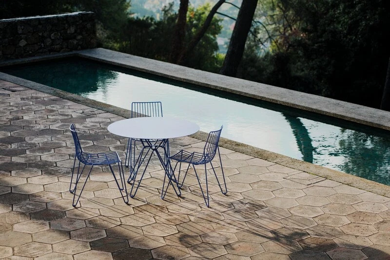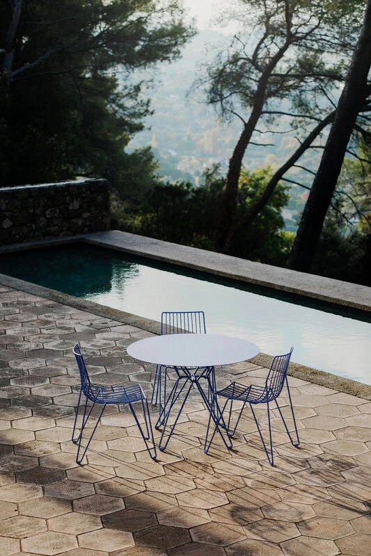 Massproductionsin Tio on elegantti ruokapöytä, joka sopii mainiosti sekä sisä- että ulkokäyttöön. Pyöreän Tio-pöydän metallista pöytälevyä kannatteleva runko on kauttaaltaan valmistettu jauhemaalatusta, galvanoidusta teräslangasta, joka antaa pöydälle sen tunnusomaisen keveän ja ilmavan ilmeen. Chris Martinin suunnittelema hienostunut Tio-kokoelma on ajattoman kaunis valinta sekä ruokailutilaan että terassille, niin kotiin kuin kesämökillekin.