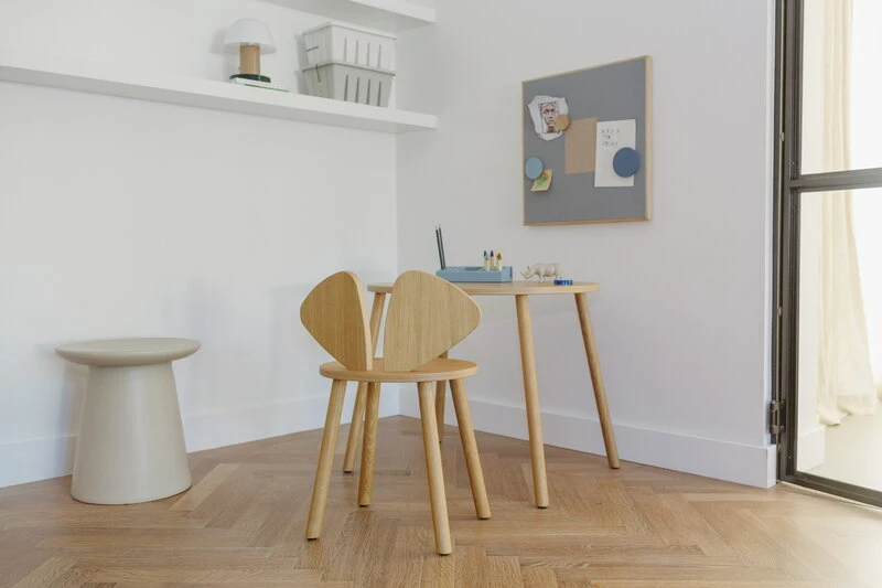 NoFredin Mouse-koulusetti todistaa, että lasten maailmassa kaikki on mahdollista – tuolillakin voi olla hiiren korvat! Tukevan ja turvallisen koulusetin pöytä ja tuoli on valmistettu tammiviilusta, ja sitä on saatavana useassa rauhallisessa sävyssä. Setti on suunniteltu 6–10-vuotiaille lapsille, antamaan työrauhan kotiläksyjä tehdessä tai inspiroimaan leikkiessä ja askarrellessa.