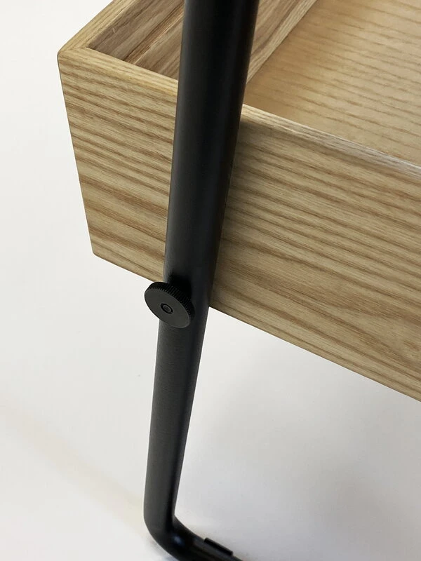 Minimalistinen tiskikaluste on valmistettu tammipuusta ja sinkitystä, jauhemaalatusta metallista, ja se on mahdollista pakata hyvinkin pieneen tilaan: osiin purettuna sen metalliosat mahtuvat tiskin tasoina toimiviin puulaatikoihin. Tiski on helppo koota ja purkaa täysin ilman työkaluja, ja aikaakin siihen kuluu vain kymmenisen minuuttia.