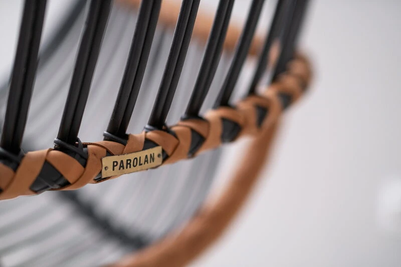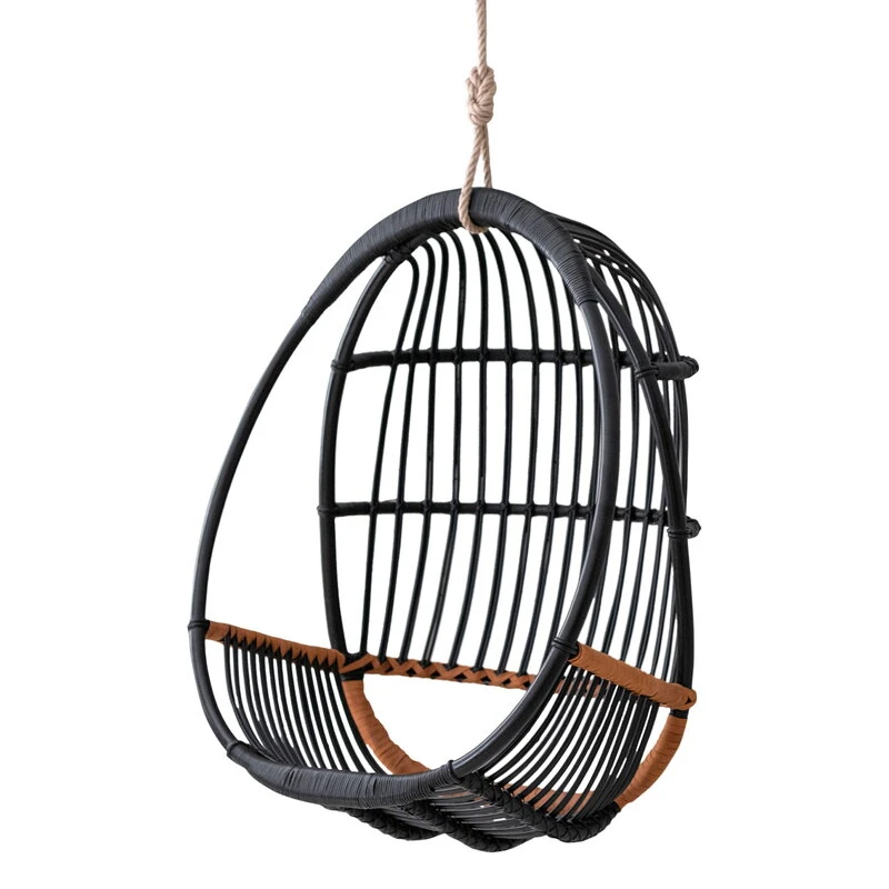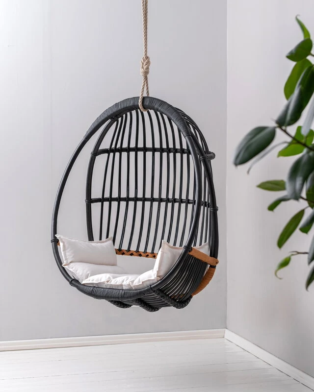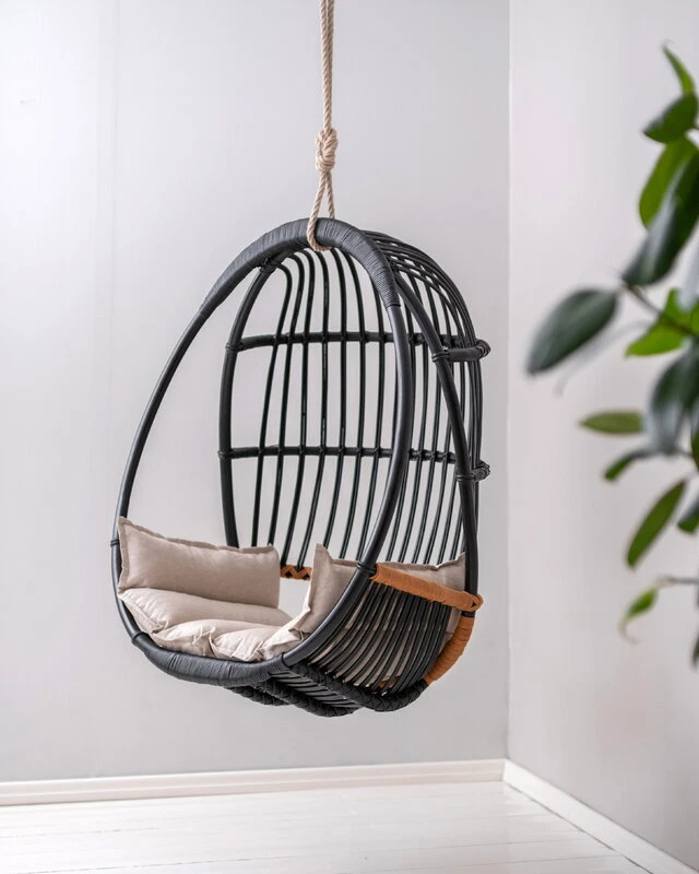 Itse riippukeinun materiaali on tietysti rottinki. Kyseessä on trooppinen puulaji, joten Sirkka viihtyy parhaiten tiloissa, joissa ilmankosteus on korkeahko. Jos kotona on kovin kuiva ilma, voi kosteutta lisätä ilmankostuttimella tai suihkimalla hieman vettä ilmaan rottinkikalusteen lähellä – pidäthän kuitenkin huolen, ettei rottinki tai nahka pääse kastumaan. Koneellinen ilmanvaihto tai lähellä sijaitseva lämpöpatteri saattavat kuivattaa ja sitä myötä haurastuttaa rottinkia.