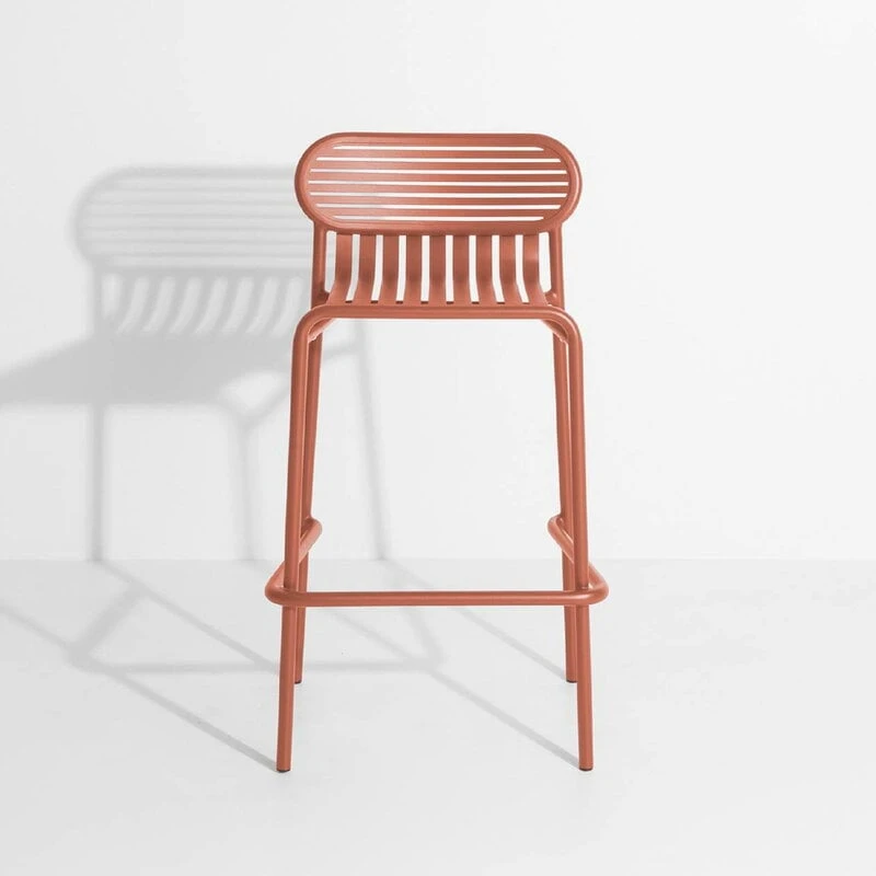 Week-end-baarituoli on osa ranskalaisen Petite Frituren alumiinisten ulkokalusteiden kokoelmaa. Viehättävien Weekend-tuolien tunnistettavimpiin piirteisiin kuuluvat niiden selkänojien ovaalinmuotoiset yksityiskohdat sekä vaaka- ja pystysuorien linjojen vuorottelu. Kaikki kokoelman tuolit ovat pinottavia.
