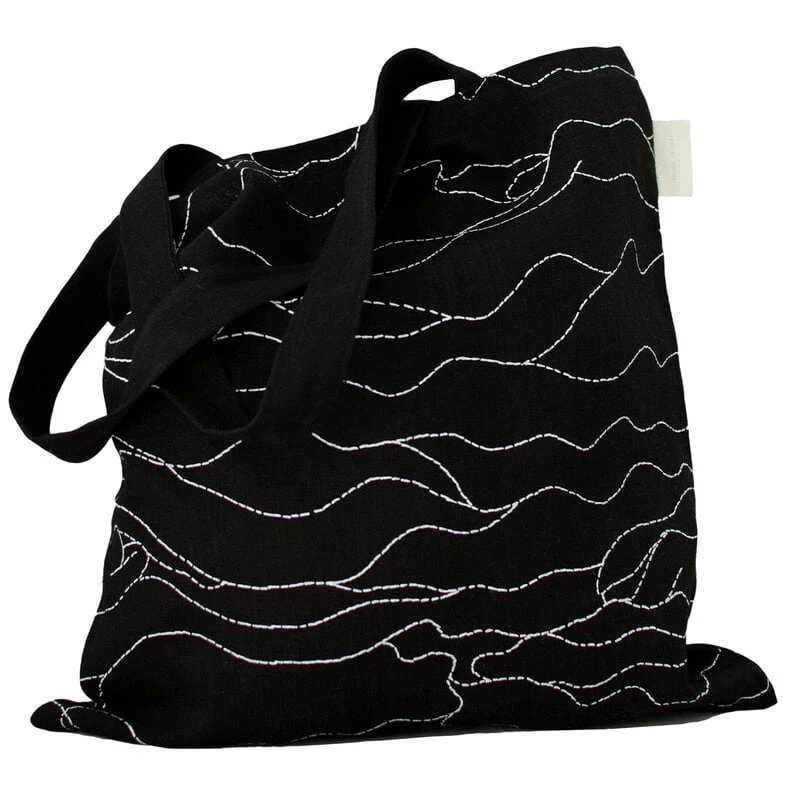 Saana ja Ollin Rakkauden meri -kangaskassin aaltoileva kuvio juhlistaa rakkautta ja sen ennalta-arvaamattomuutta: rakkaus eri muodoissaan voi muuttaa yksilön elämää moninaisin tavoin. Viivamaisista rakkauden aalloista piirtyy myös erilaisia muotoja ja jopa ihmishahmoja.