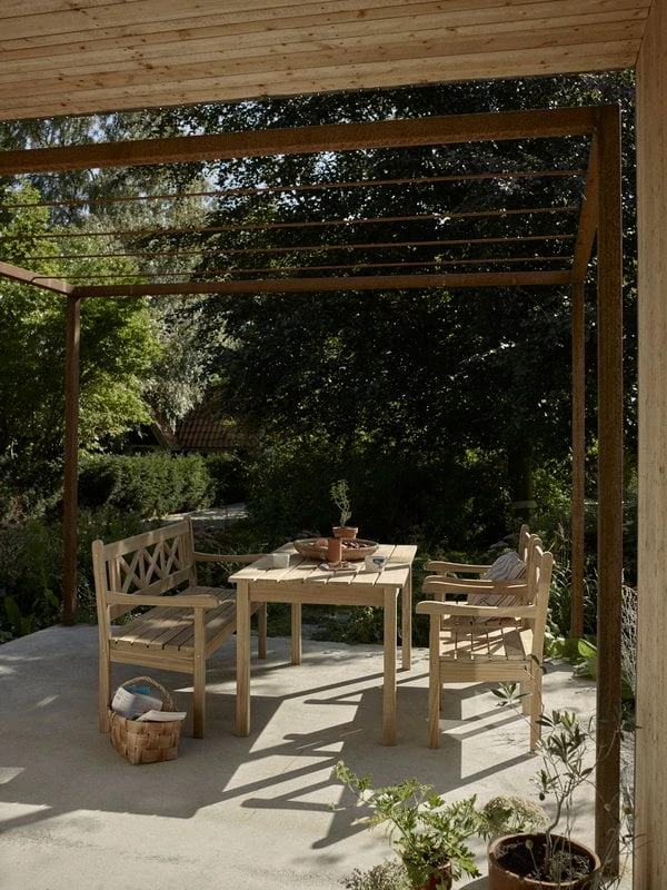 Skagerakin Skagen-penkillä on tukeva tiikkipuinen runko, jota elävöittävät selkänojan ristikkäiset linjat. Mogens Holmriisin suunnittelema Skagen-kokoelma on saanut nimensä ja innoituksensa Tanskan pohjoisimmasta kärjestä, joka oli 1800-luvun lopulla vilkas, taiteilijoiden suosima alue. Hiljalleen hopean sävyisiksi patinoituvat Skagen-ulkokalusteet henkivät ajatonta tanskalaista nostalgiaa, joka istuu kauniisti myös tämän päivän puutarhoihin.
