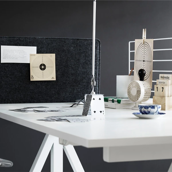 String Works -pöytäsermi rajaa työpöydät toisistaan tarjoten työpisteelle yksityisyyttä. Sermi kiinnitetään työpöytään ruuvein.