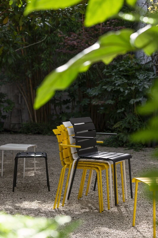 valerie objectsin Aligned-jakkaran näennäisen yksinkertainen ilme yllättää: epäsymmetriset, alumiinista valmistetut säleet antavat klassisen vähäeleiselle istuimelle täysin uudenlaisen persoonan. Tunnetun hollantilaissuunnittelija Maarten Baasin kekseliäs ja leikkisä kädenjälki on vahvasti esillä jokaisessa yksityiskohdassa – Aligned-jakkara on luotu täsmällisesti Baasin lyijykynäpiirroksen pohjalta. Kaunis ja kestävä ulkokäyttöön soveltuva jakkara sopii niin puutarhapöydän ääreen kuin sieväksi sivupöydäksi aurinkotuolin viereen ja sen hurmaavan persoonallinen ilme ihastuttaa vuodesta toiseen.